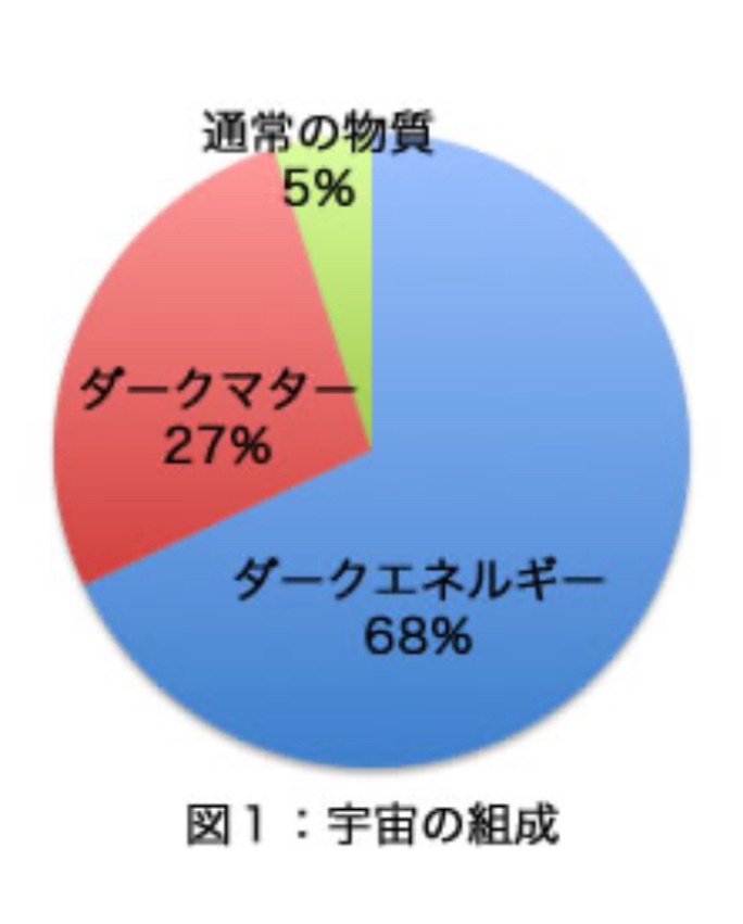 宇宙を調べると、われわれが知っている、陽子や中性子など、『眼に見える』物質は5%(私たちはどんなに頑張って目でみてそれに対して理解完璧にしても5%。少ない!)