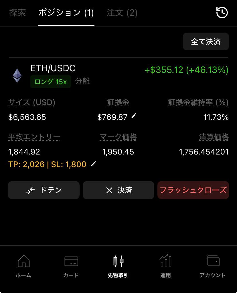 昨日は、ETHにエントリーをロングで、$1870 レバレッジ15